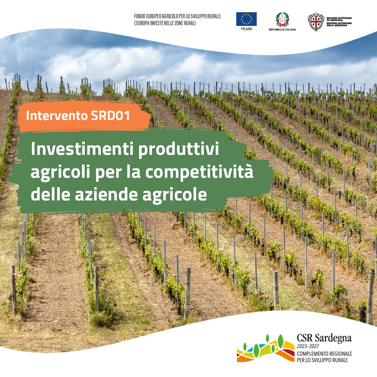 L’ Assessorato e l’ Ufficio Attività Produttive informano che la Regione Autonoma della Sardegna, attraverso l’Assessorato dell’Agricoltura e Riforma Agro-Pastorale, ha pubblicato il bando relativo all’Intervento SRD01 – “Investimenti produttivi agricoli per la competitività delle aziende agricole”, nell’ambito del Piano Strategico della PAC 2023-2027 – Complemento Regionale per lo Sviluppo Rurale 2023-2027.