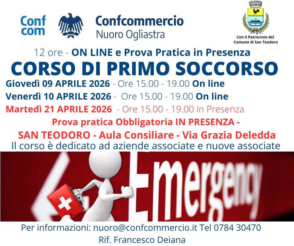 L’ Assessorato e l’ Ufficio Attività Produttive informa che Confcommercio Nuoro Ogliastra, con il patrocinio dell’Amministrazione Comunale, organizza un Corso di Primo Soccorso rivolto alle imprese associate e alle nuove aziende che intendono aderire all’associazione.